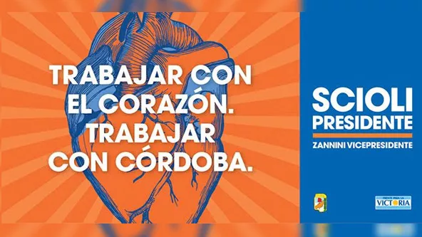 La campaña desarrollará un paralelismo entre Córdoba y el corazón de la república. Para vía pública, usará una imagen con trazos de un corazón sobre un fondo naranja, lleva un texto en el centro que dice: “Trabajar con el corazón. Trabajar con Córdoba”.
