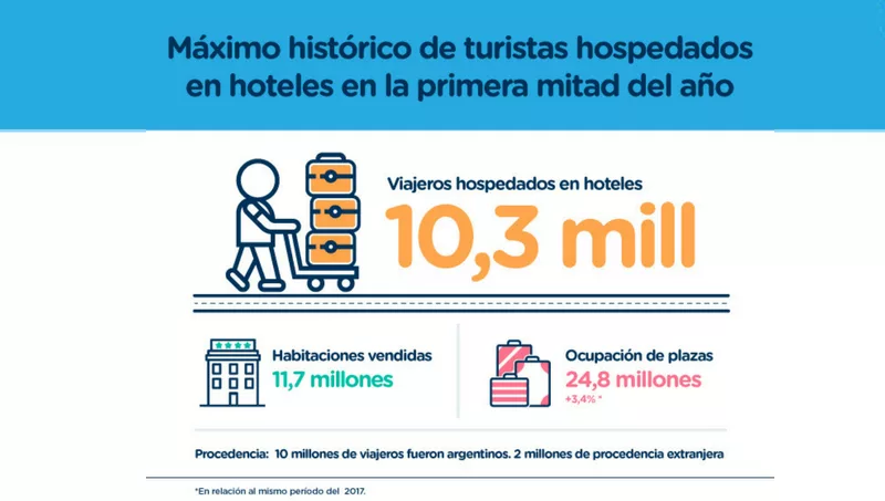Durante el primer semestre del 2018 se alcanzó el máximo histórico de viajeros hospedados en hoteles desde que se realiza este relevamiento, se registraron 10,3 millones de viajeros hospedados en hoteles.
