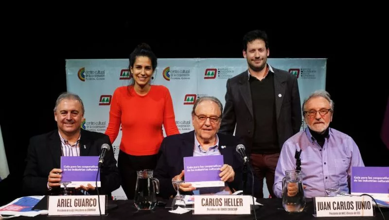 Soledad Venegas y Ernesto Giacomini, coordinadores del MARCA, hicieron entrega de la Guía para las Cooperativas de las Industrias Culturales, desarrollada en conjunto con el INAES, a tres grandes referentes del movimiento cooperativo argentino: Ariel Guarco, presidente de la Confederación Cooperativa de la República Argentina (COOPERAR) y de la Alianza Cooperativa Internacional (ACI), Carlos Heller, presidente del Banco Credicoop y diputado nacional, y Juan Carlos Junio, presidente del IMFC y director del CCC “Floreal Gorini”.