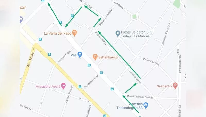 Los automovilistas que circulen por Av. Rafael Núñez hacia el noroeste deberán girar a la derecha en Fuchs, continuar por A. Nores, girar nuevamente a la derecha en Arrambide, tomar Francisco de Olea y retomar Av. Rafael Núñez por Potel Junot.