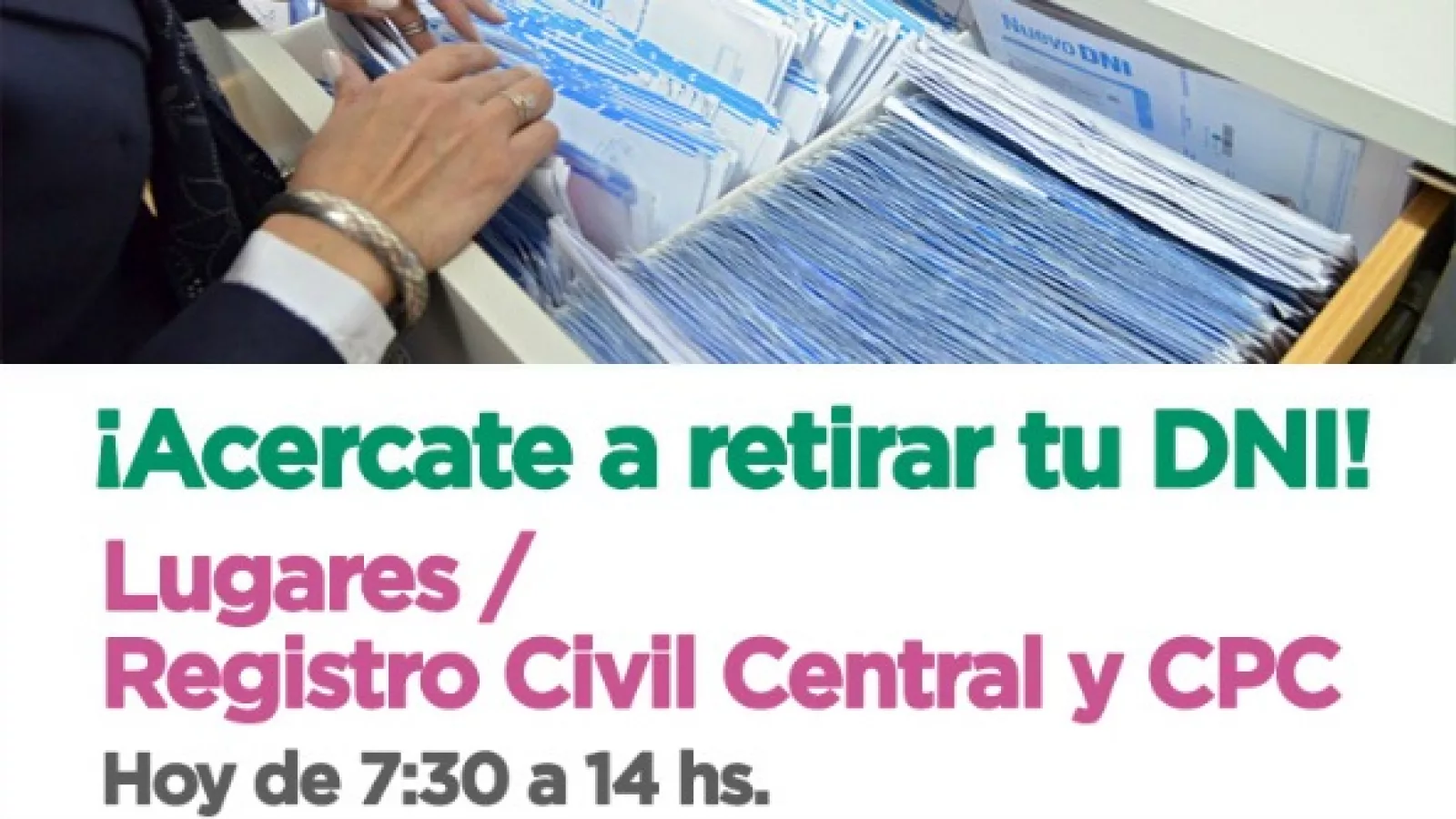 Los vecinos que gestionaron su DNI y aún no lo han retirado, pueden hacerlo hoy miércoles, el jueves y el viernes de 7:00 a 17:00 horas y el sábado y domingo de 8:00 a 18:00 horas.