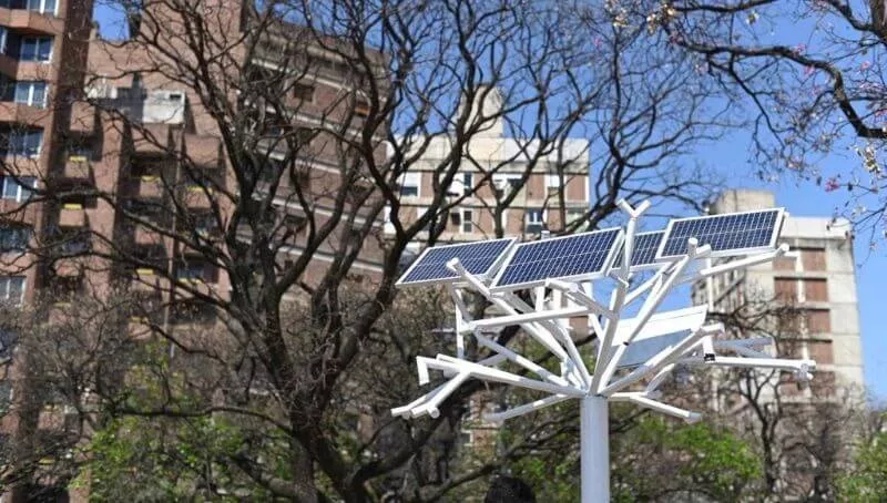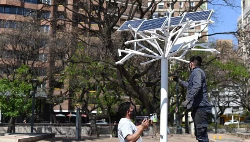 El “Árbol Solar” instalado en la Plaza de la Intendencia cuenta con nueve puertos USB y produce su propia iluminación, para que las plazas donde se coloque estén permanentemente iluminadas con energías renovables.