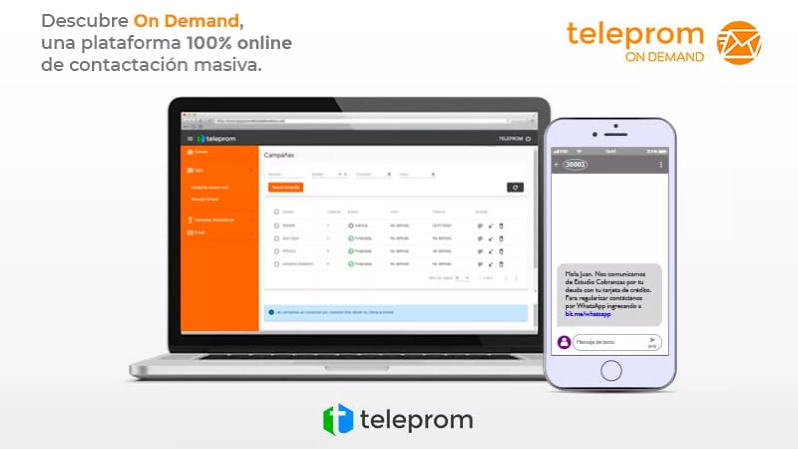 El envío masivo de SMS con remitente número corto (forma oficial de envío masivo de mensajes de texto) es el servicio estrella de Teleprom on Demand. Es la única forma de llegar en el acto a grandes o pequeñas bases de datos de celulares sin restricciones, sin bloqueos, y sin requerir haber sido agendado previamente por el destinatario (como sí requieren las difusiones de WhatsApp).