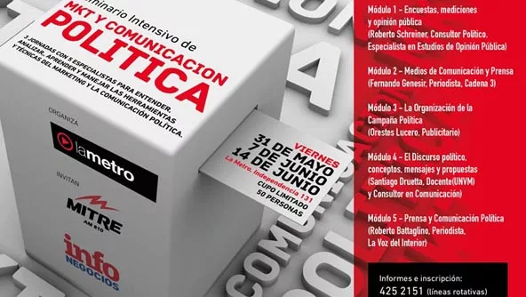 La Metro-Escuela de Cine, Video y Televisión- presenta el primer Seminario Intensivo de Marketing y Comunicación Política del interior del país dirigido a candidatos, secretarios y responsables de prensa y comunicación de municipios, funcionarios de comunicación y prensa de gobiernos, partidos políticos, asesores, consultores y equipos de comunicación política electoral. Serán 3 días de curso e InfoNegocios quiere que participes. Si no querés perderte esta chance, decinos acá qué días se llevará a cabo el seminario. Pista acá.