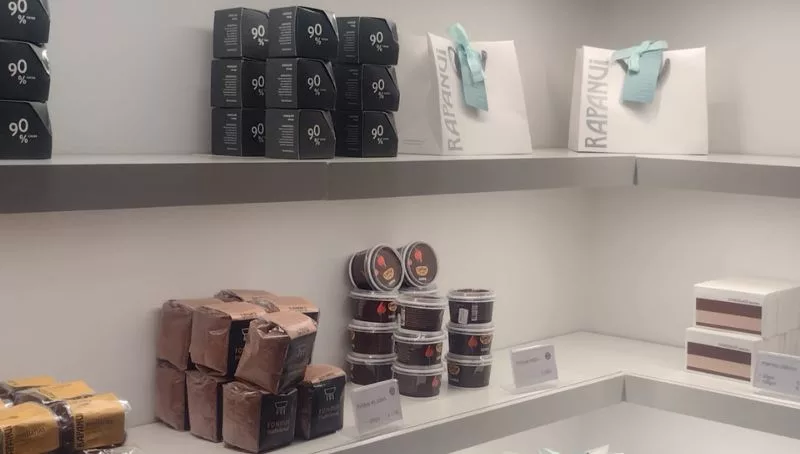 “Rapanui Casa Minetti” (así dice la señalética) cuenta, por ahora, con dos sectores claramente diferenciados: una “Tienda al Paso”, con opciones de chocolate por peso y distintas presentaciones envasadas: bombones, chocolates, marroc o maní con chocolate, entre otras.
