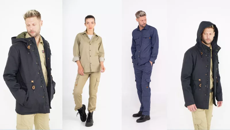 Los joggers son de algodón rústico reciclado. Las camperas son de tejido sarga de algodón reciclado, poliester y elastano. Los bolsos y mochilas se confeccionan con tejidos reciclados en varios colores y texturas.