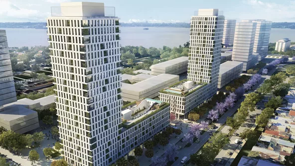 Se trata de cuatro edificios con departamentos (420 en total) de uno, dos, tres y cuatro ambientes, amenities, locales comerciales y cocheras subterráneas, en un predio cuyo masterplan estuvo a cargo del estudio Foster + Partners.