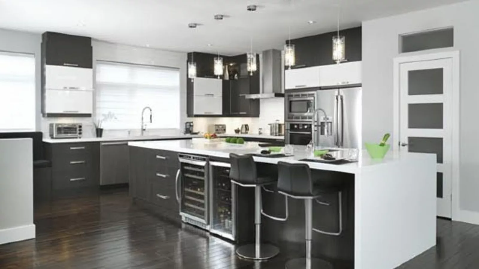 La combinación de blanco y negro se amalgaman a la perfección con los detalles de acero de mobiliario y electrodomésticos.