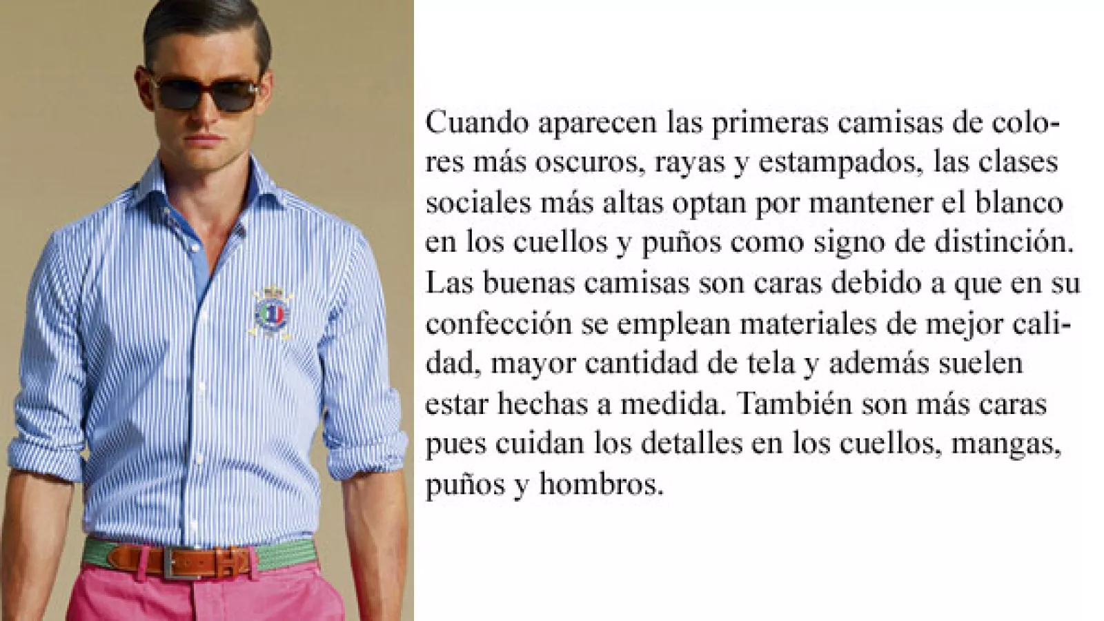 La historia de la camisa es particular. Originariamente se la consideraba una prenda de ropa interior usándola por debajo de otras y luciendo solo el cuello, es por ello que “quedarte en mangas de camisa” está mal visto entre los caballeros… es como andar en calzoncillos. En la fotogalería de hoy refiero sobre ella y doy detalles a tener en cuenta a la hora de adquirirlas, espero que te sirvan y así disminuyas la posibilidad de “clavarte” con alguna o al menos sepas lo que estás llevando.