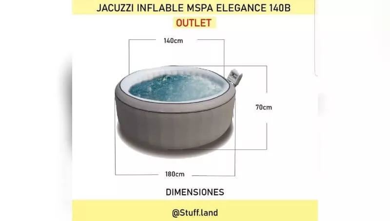 Con capacidad para 4 personas, bomba propia y regulador de temperatura, el jacuzzi inflable modelo MSPA Elegance 140B que ofrece Stuff Land puede ser utilizado tanto en ambientes interiores como exteriores. Posee 90 días de garantía por problemas de fabricación, seguimiento postventa y asegura durabilidad, resistencia, practicidad y fácil mantenimiento. Para instalarlo solo se precisa contar con un desagüe (rejilla), un enchufe y agua fría o caliente.