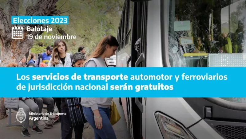 A través de la resolución 610/2023, el Ministerio de Transporte de la Nación, a cargo de Diego Giuliano, estableció la gratuidad para todo el transporte urbano ferroviario y automotor de jurisdicción nacional durante el domingo 19 de noviembre, cuando se celebrará el balotaje para la elección presidencial.