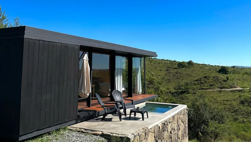 La vivienda tiene 40m2, cuenta con cocina, baño, cama matrimonial, proyectos para películas y ventanales que conectan el interior con el paisaje, la sensación de amplitud se expande más allá de los límites físicos de la estructura y brinda imponentes vistas al Valle de Calamuchita y Lago Los Molinos. Además, un deck con una pileta exclusiva, parrilla eléctrica Tromen, conexiones de agua, luz y Starlink. Busca atraer a quienes desean una experiencia exclusiva y personalizada.