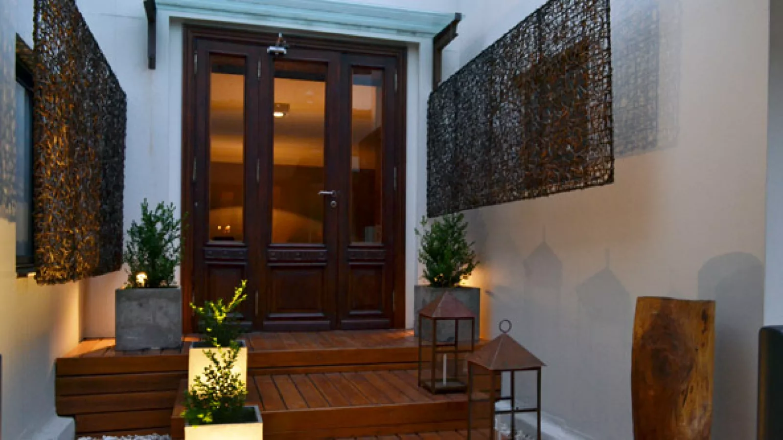 En el ingreso principal se genera una situación jerarquizada, con piezas rústicas: dos esculturas a los costados suspendidas en los muros, más una guía de candelabros en apoyo a las luminarias embutidas en los escalones, donde reposan pequeños arbustos. Otro detalle solemne es la puerta de pinotea, antigua, protegida con una marquesina de vidrio. El segundo ingreso (y egreso) es independiente –enunciado al comienzo- y se produce a través del palier del edificio.
