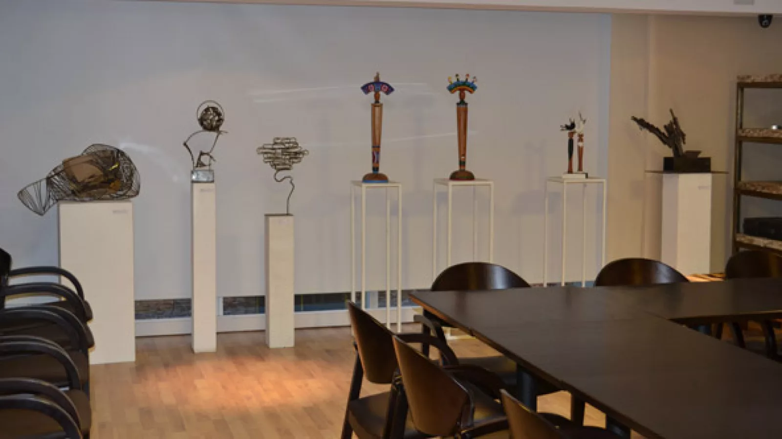 Es un espacio con una personalidad muy joven y sobria. Y de allí surge la decoración: muros tapizados con tela tipo arpillera color arena, una mesa directorio para 24 personas de guatambú negro, un paño vidriado que revela el ladrillo lastimado de la medianera y a la vez oficia de telón de fondo para las esculturas, colección del hotel.