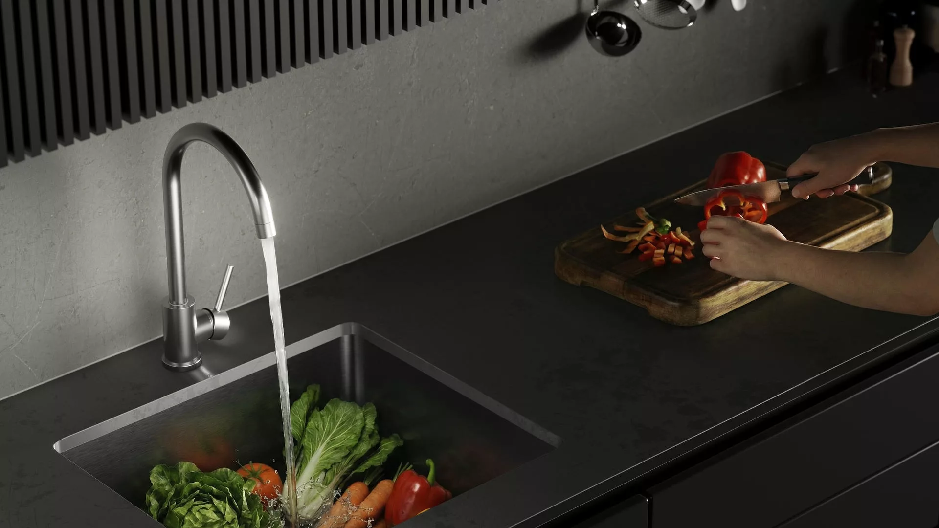 En baño, la línea se inclina por perfiles más rectos y atemporales, mientras que en cocina suma un contraste entre cuerpo recto y pico curvo, buscando ergonomía y comodidad de uso.