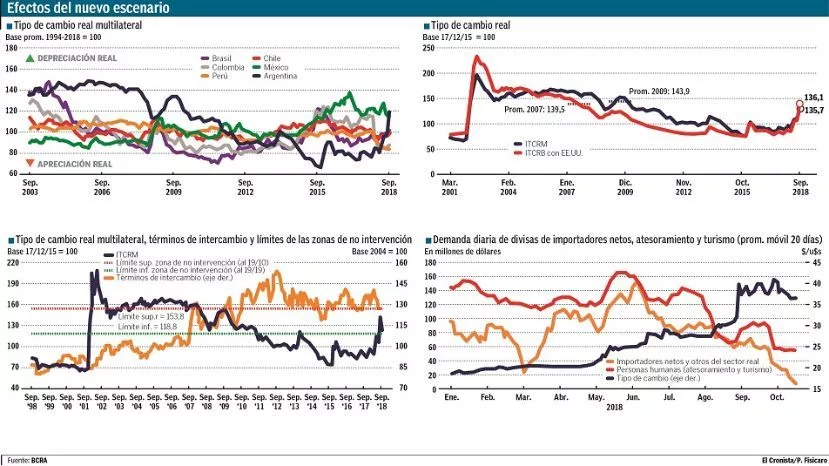 En ese sentido, el propio titular del BCRA, Guido Sandleris, dijo en conferencia de prensa que las zonas de intervención y no intervención cambiarias se fijaron teniendo en cuenta que se parte de un tipo de cambio competitivo. "El tipo de cambio real multilateral en el límite superior de la zona de no intervención se ubica en niveles del año 2003, momento en el que el tipo de cambio había sobrerreaccionado al colapso de la convertibilidad", indicó el IPOM.