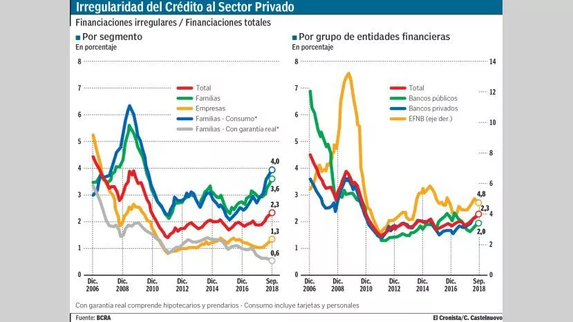 Según los datos de septiembre del Informe sobre Bancos del Banco Central (BCRA), la irregularidad en el crédito al sector privado se mantuvo prácticamente estable en septiembre con respecto al mes anterior, pasó del 2,2% de las financiaciones totales al 2,3%. Sin embargo, en comparación con septiembre del año pasado el número supone una variación de 0,5 punto porcentual.