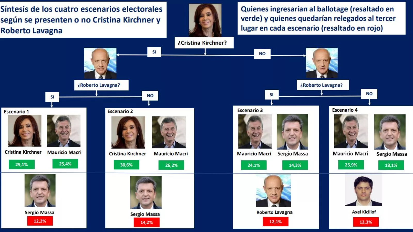 - Si CFK no se presentara y en su lugar lo hicieran candidatos afines (Axel Kicillof, Daniel Scioli y Felipe Solá), sería Sergio Massa quien