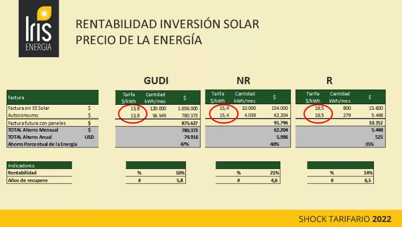 En los GUDIS (Grandes Usuarios de Distribuidor) se puede obtener un ahorro del 47% si tomamos como ejemplo la escala tarifaria actual, con una rentabilidad en dólares del 16% anual y un recupero de la inversión en menos de 6 años.
