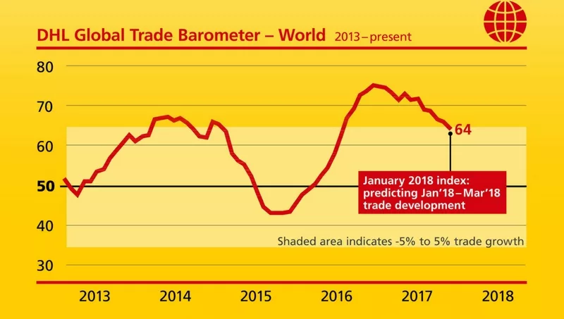 El DHL Global Trade Barometer, para enero del 2018, indica que el comercio internacional seguirá creciendo dentro de los siguientes tres meses. En su publicación inicial, el índice reveló una puntuación de 64, lo que está ligeramente por debajo de los valores calculados para los meses anteriores. Eso significa que el comercio internacional se sigue considerando en modo expansivo; sin embargo, el crecimiento pierde impulso. El descenso se debe a proyecciones débiles para el comercio chino y japonés, que se compensan sólo parcialmente por las proyecciones mejoradas para la India, Corea del Sur y Gran Bretaña.