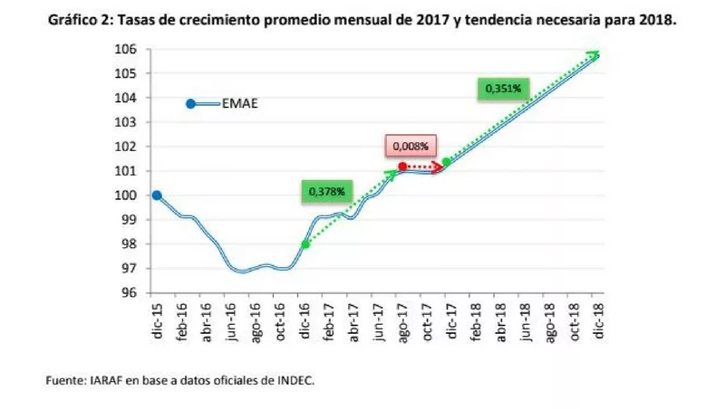 Y finaliza el IARAF: “Para lograr el 3.5% de crecimiento en 2018, la economía debería retomar el sendero de crecimiento que tuvo los primeros 8 meses del año, alcanzando una tasa de crecimiento promedio mensual de 0.351%. En el gráfico 2 puede apreciarse el sendero que debería seguir la actividad económica”