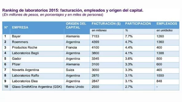 La consultora KPMG difundió una radiografía del meganegocio de los laboratorios donde revela detalles de un mercado del que participan algo más de 200 empresas que en 2015 vendieron por casi US$ 5.000 M. El estudio arroja datos interesantes, como que entre 2005 y 2015 se importaron más medicamentos que durante el menemismo y que cada argentino gasta, al mes, casi $ 200 en remedios. Además, muestra el ranking de las que más venden, con escasa participación de nacionales.