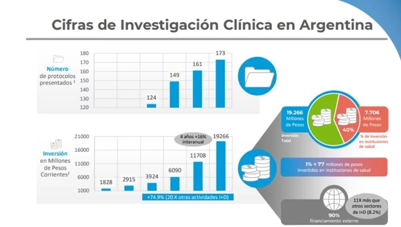 Los datos más recientes, publicados por el MINCyT, indican que entre 2016 y 2020 la actividad aumentó un 75%. Al comparar esta cifra con el crecimiento de la I+D del resto del sector empresario (un 3,6% entre 2016 y 2020), se comprueba que la investigación clínica es una de las actividades con mayor crecimiento en los últimos años. La información surge de la Encuesta sobre Investigación y Desarrollo (ESID) del sector empresario argentino, elaborada por la Dirección Nacional de Información Científica del MINCyT. De acuerdo con los resultados de la ESID, el monto invertido pasó de 11.877 millones de pesos corrientes en 2019 a 19.266 millones en 2020. En valores constantes (es decir, no afectados por inflación), ese aumento representa un crecimiento interanual del 16%.