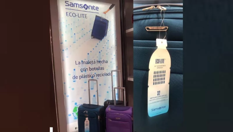 -Samsonite hace la recolección de botellas de plástico PET usadas, ordenadas y desinfectadas que después son trituradas y derretidas hasta lograr un polímero líquido. Este líquido caliente se purifica y se extrae como hilo de filamento y con este hilo se tejen telas duraderas con las que finalmente se construye la valija.