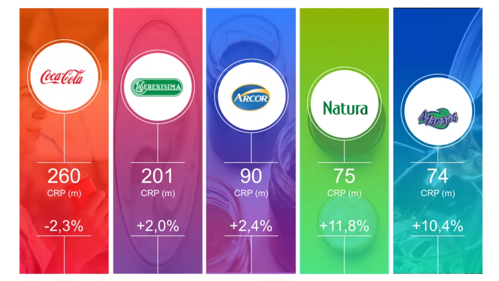 Todas las otras marcas del top 5 mostraron un aumento de CRP: La Serenisima (2ª posición y +2% en CRP), Arcor (3er lugar y +2,4% en CRP), Natura (4ª posición y +11,8% en CRP) y Manaos (5ª posición y +10,4% en CRP).