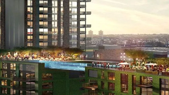 La piscina se sostiene entre las estructuras de 10 pisos cada una del complejo de departamentos de lujo "Embassy Gardens", en el suroeste de la la ciudad.