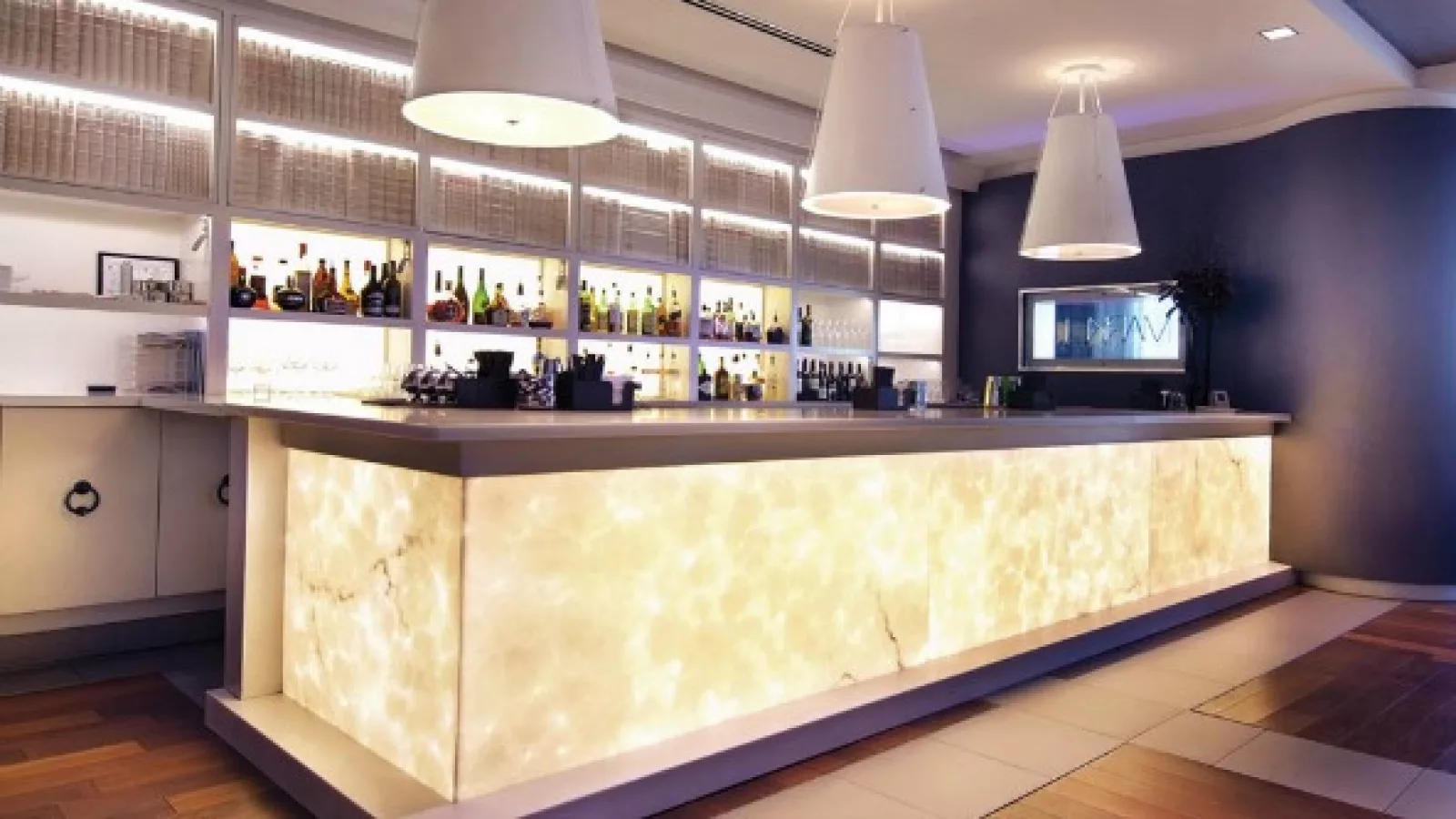 Y lo cierto es que las propiedades de la poliresina permiten que la luz artificial como la natural lo atraviesen generando así una particular iluminación y permitiendo que se aprecie más el diseño del “mármol”, pues, las vetas resaltan y los remolinos del yeso puro se notan a la perfección.