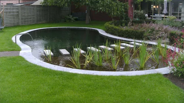 En el fondo del estanque se coloca una lona impermeable y se ubican las especies: plantas de borde, flotantes como nenúfares y lotos, y especies submersas oxigenantes que proporcionarán el crecimiento acelerado de los microorganismos que eliminan las bacterias y mantienen la piscina limpia. Es recomendable separar el sector de la piscina propiamente dicha del área de depuración por medio de algún recurso arquitectónico.