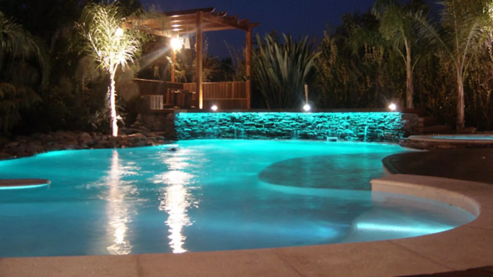 La iluminación puede darle a la piscina un protagonismo exclusivo en el parque o puede mimetizarla con él. Esto queda a gusto del cliente y de ahí se parte.