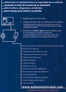 Pensando para muchos automovilistas que no quieren y/o no pueden llevar el control del mantenimiento del auto. Más info en www.autoasistenciaok.com.