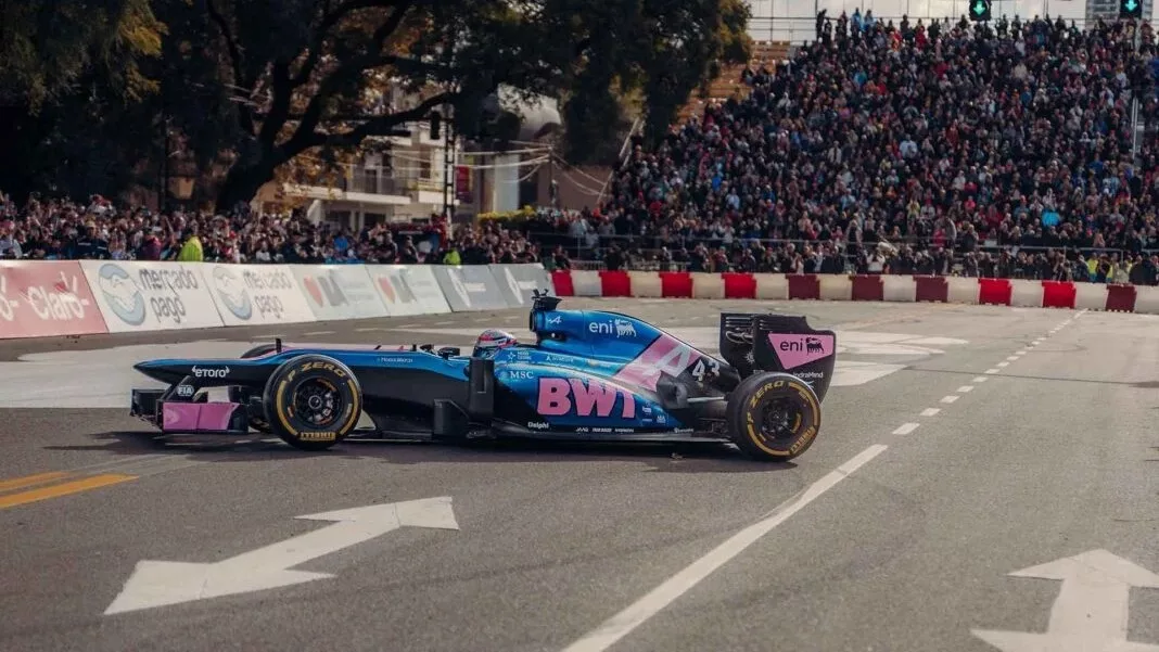 A bordo de un monoplaza con los colores del equipo BWT Alpine Formula One Team, el piloto argentino hizo vibrar a miles de personas con el sonido de un motor Renault V8, en una postal poco habitual para la ciudad.