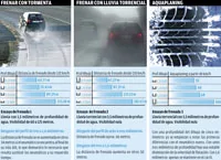 Mientras que una cubierta con 8 mm de profundidad (nueva) consigue detener el vehículo en algo menos de 65 metros con tormenta y en 70 metros con lluvia torrencial, y manifiesta el aquaplaning a partir de los 100 km/h, otra con 5 mm de espesor, para las mismas pruebas, se detendrá en más de 70 m, 87 m y el aquaplaning aparecerá a partir de los 61 km/h.