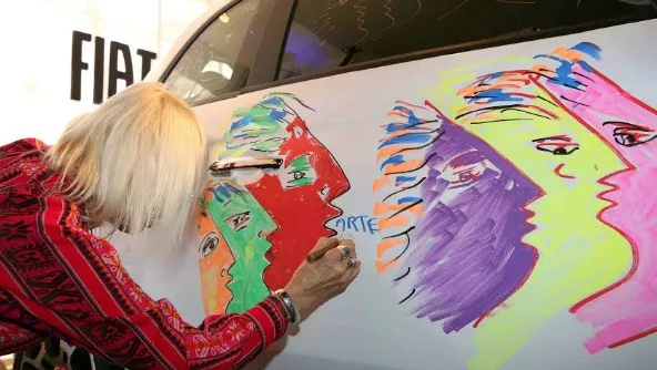 Sobre el inconfundible logo Fiat, la firma de la inconfundible artista Minujín.