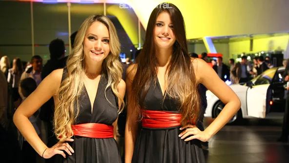 Bienvenidos.  Las señoritas que recibían a los invitados a un evento "bien Audi": sin discursos y con los autos en el centro de toda la escena.