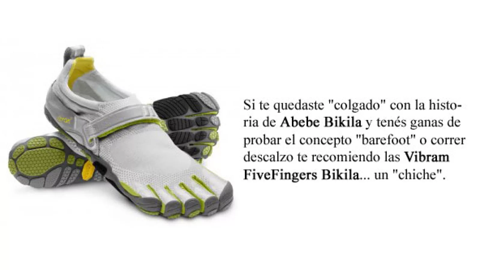 Al que no le interesaba calzado alguno era a Abebe Bikila (1932 - 1973). Este etíope se convirtió en héroe nacional por ser el primer africano en ganar una medalla dorada olímpica. Su prueba era el maratón y en las olimpíadas de Roma de 1960 registró dos horas quince minutos y dieciséis segundos para completar los 42 kilómetros con 196 metros y marcar record mundial... nada de extrañar para un profesional sino fuera que ¡los corrió descalzo!.