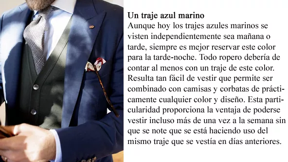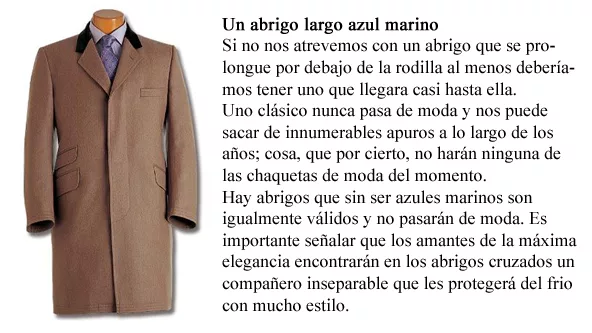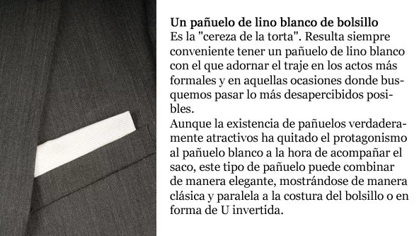 Pero nosotros, elegantes caballeros, le hacemos “pito catalán” a las tentaciones de pasarelas y centramos nuestra atención en los conceptos y reglas que regulan el buen vestir. Pensar que nuevo elemento ingresará al armario hace que nuestras compras sean inteligentes, disminuye el riesgo de adquirir objetos pasajeros y aumenta las posibilidades de alternar conjuntos sin dar la impresión de estar repitiendo prendas.