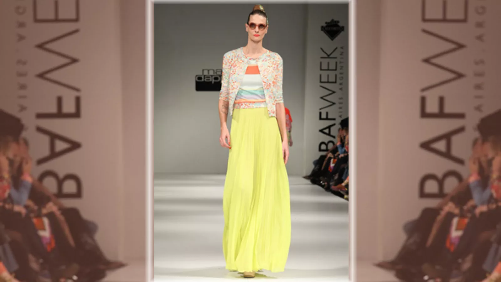 M.Dappiano; maxi falda hippie chic en colores neon y chaqueta corta en estampados muy coloridos.