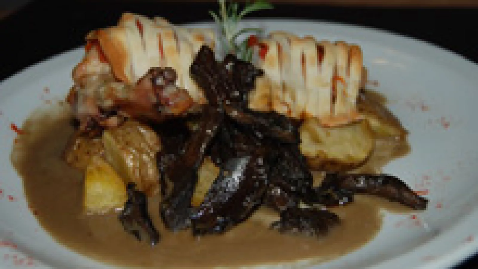 • Pollo enrejado en salsa de hongos con papas rústicas.