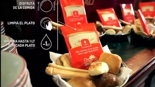 Para reducir la pérdida de agua que se genera al lavar los platos, la agencia introdujo una rodaja de pan Fargo es paquetes individuales que fueron distribuidos en diversos restaurantes de Buenos Aires.