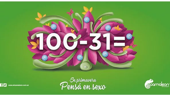 Continuando con el tono joven y popular de la marca, las piezas buscan que en la estación del amor, la gente piense más en sexo. Con esta serie de titulares, Camaleón logra que en la cabeza del público aparezcan imágenes y palabras explícitas que todos conocemos.