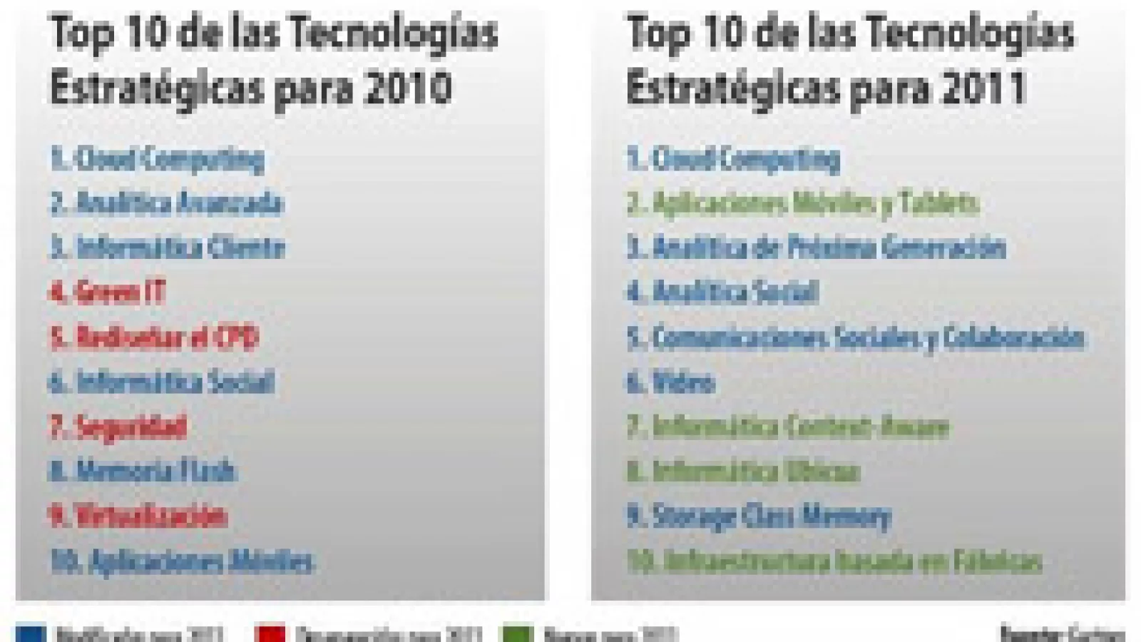 (Por Eduardo M. Aguirre - @eduaguirre) Todos los años la consultora Gartner identifica y destaca las que -según su criterio- serán las tecnologías estratégicas durante los 12 meses siguientes. Así es que hace unos días publicó este decálogo con vistas a 2011. Pero más allá de verlo es interesante también compararlo con lo que la misma empresa destacaba unos años atrás, para ver no sólo la foto sino una parte de la película.