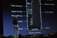 Cámara frontal, microSIM, cámara y flash LED detrás. Es un 24% más delgado que el 3GS. "De hecho es el smartphone más delgado del planeta" dijo Jobs.