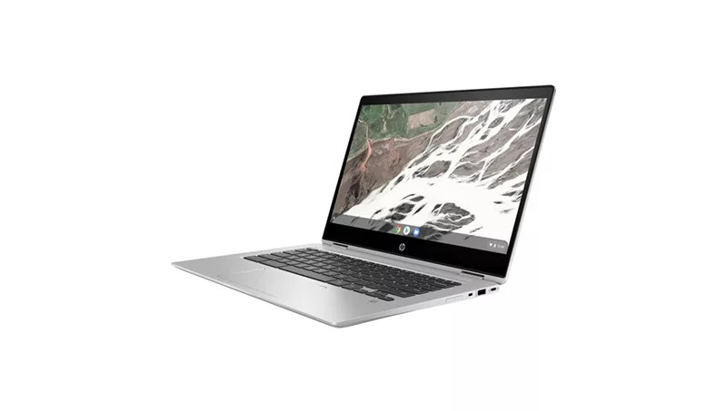 En primer término la Chromebook Enterprise x360 14E G1 muestra un diseño en aluminio natural. Esta convertible de 14 pulgadas cuenta con procesadores Intel Core i5 e i7, tiene un rendimiento de batería de hasta 13 horas, sistema de sonido del especialita B&O, pantalla táctil con bordes angostos y puerto USB-C.