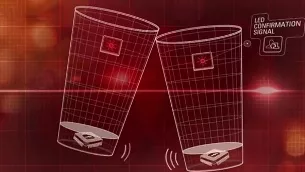 Luego, utilizando un chip de tecnología NFC transfiere la información de los perfiles cuyos dueños hacen un brindis, es decir, chocan sus vasos, en tal caso un led rojo se enciende para indicar que la transferencia de información se ha realizado con éxito.