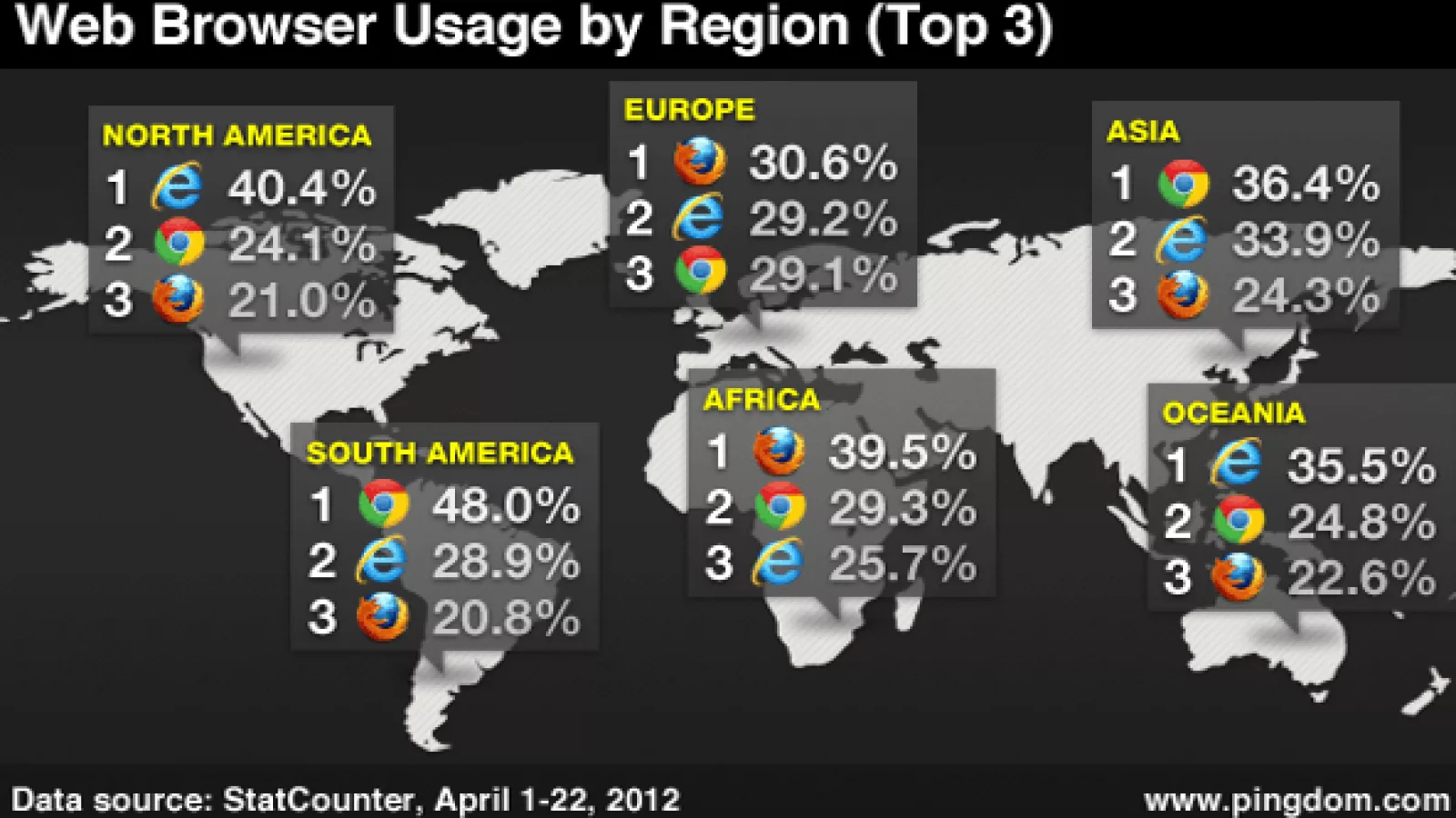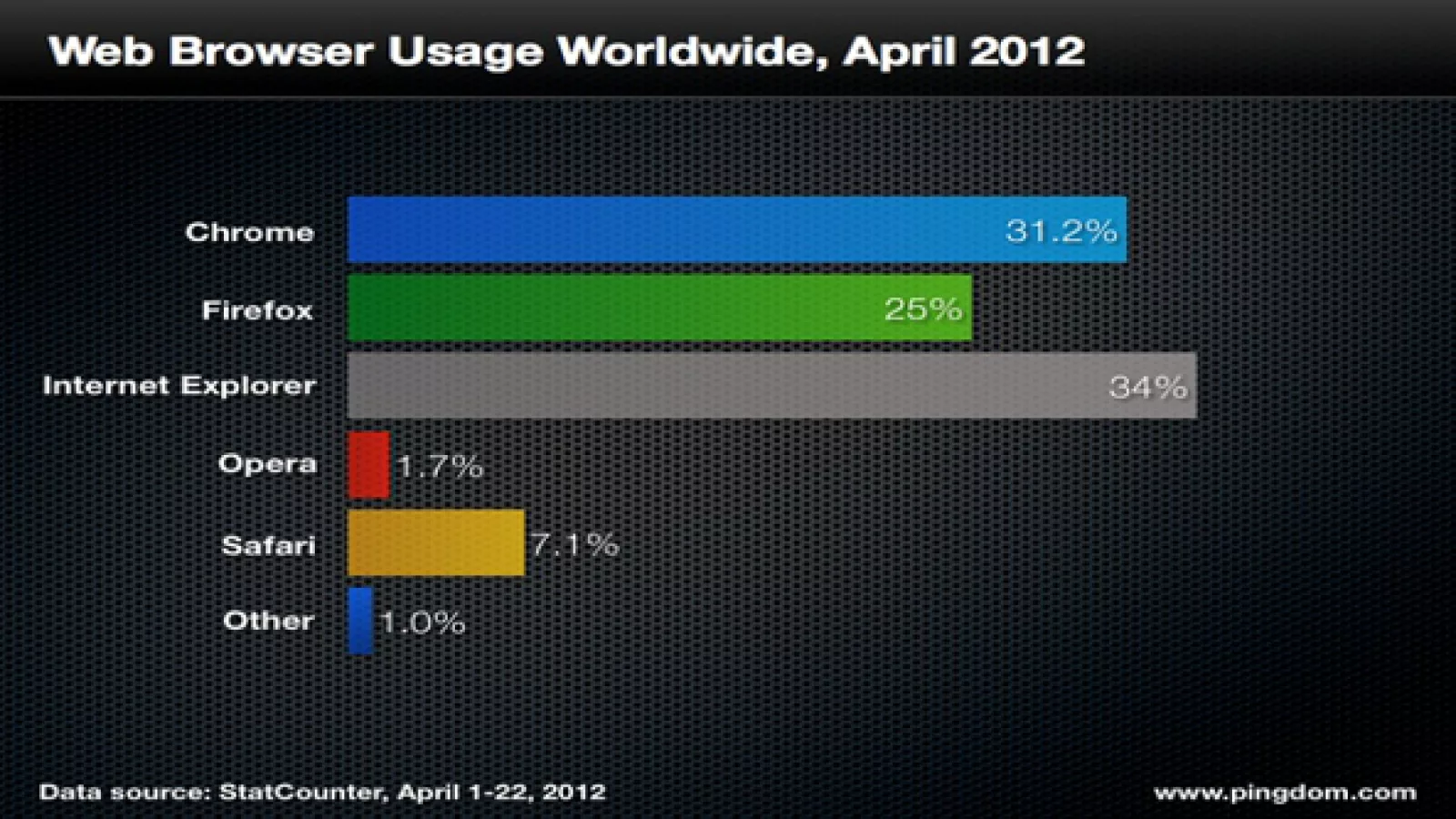 El blog especializado Pingdom es uno de los que lleva un registro de utilización de navegadores en todo el mundo. De sus estadísticas se desprende que Internet Explorer (de Microsoft) sigue manteniendo su liderazgo a nivel global con el 34% de preferencias, mientras (cada vez más) cerca se encuentra Chrome (el de Google) con el 31,2% de participación, quedando en un digno tercer lugar Firefox con el 25% de share. Cabe destacar que no es despreciable el 7,1% que mantiene Safari, el navegador que por defecto encontramos instalado en las Mac. Mientras que el quinto navegador que alcanza a distinguirse en los gráficos de participación es Opera con su modesto 1,7% de penetración.