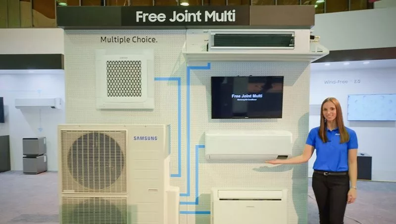 En la exposición, Samsung también mostró su sistema DVM S Eco HR y el sistema para exteriores 4ton FJM (Free Joint Multi). El DVM S Eco HR es un split con sistema VRF de gran capacidad que es capaz de enfriar y calentar simultáneamente dos habitaciones separadas, ideal para hoteles gracias a sus múltiples puntos de instalación, otorgando flexibilidad a la hora de instalarlo.